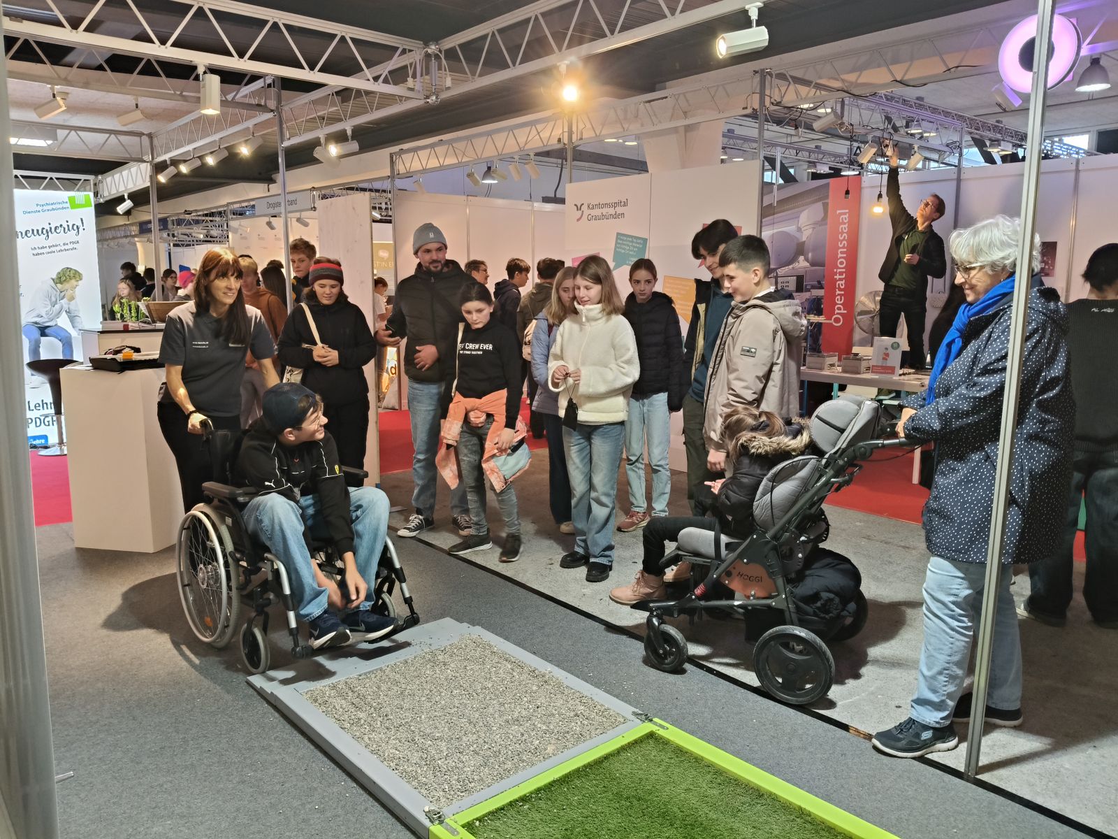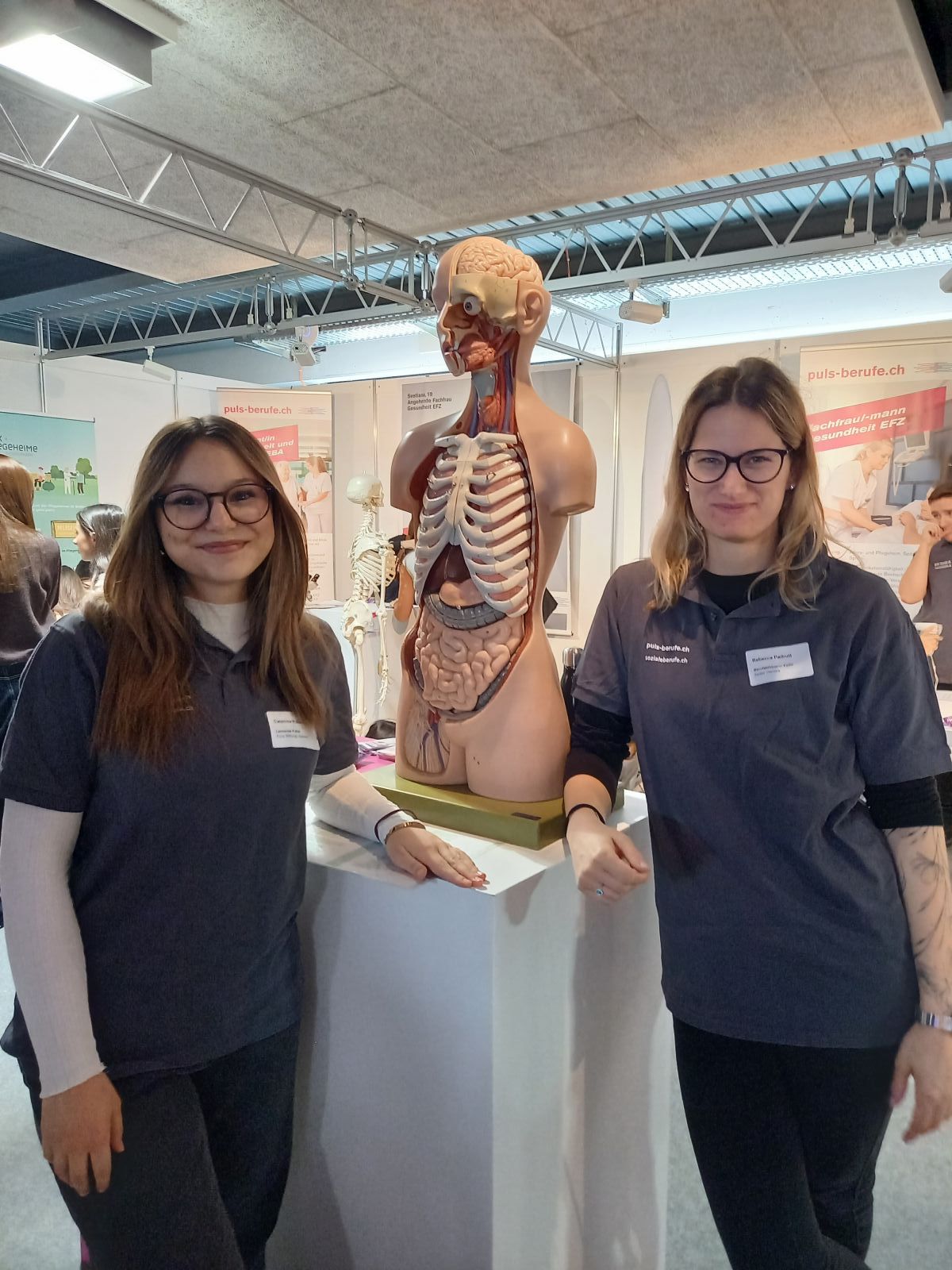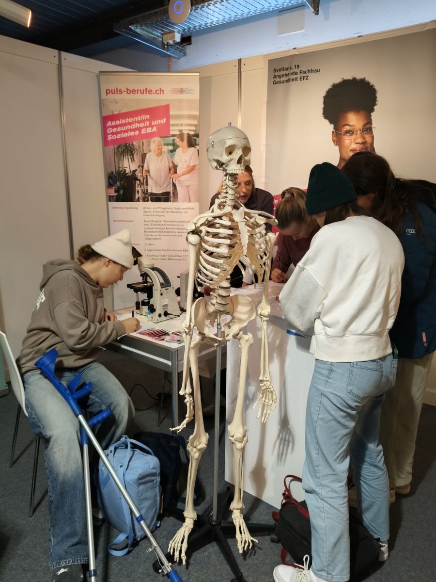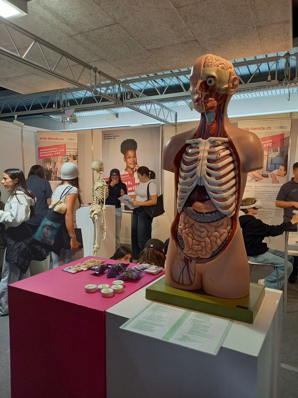 An unserem Stand konnten die Besucherinnen und Besucher praxisnah und interaktiv in die Berufswelt eintauchen. Ein besonderes Highlight war der gut besuchte Hindernisparcours ("Nutze deine Sinne"), der ihnen die Möglichkeit gab, Beeinträchtigungen hautnah zu erleben und sich so in die Situation von Menschen hineinzuversetzen, die auf Hilfe angewiesen sind. Grosse Begeisterung weckte auch die Anatomie-Ecke, in der man mittels VR-Brillen das Herz anschauen und den menschlichen Körper virtuell erkunden konnte. Engagierte Fachpersonen unterstützten die Jugendlichen zudem beim Kennenlernen der Organe am Torso.