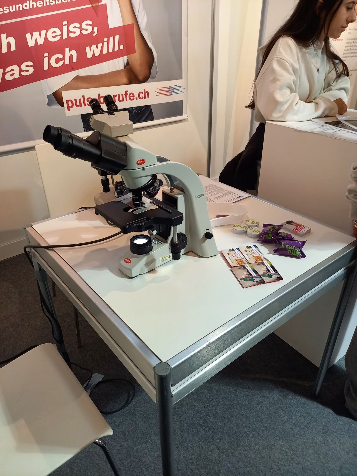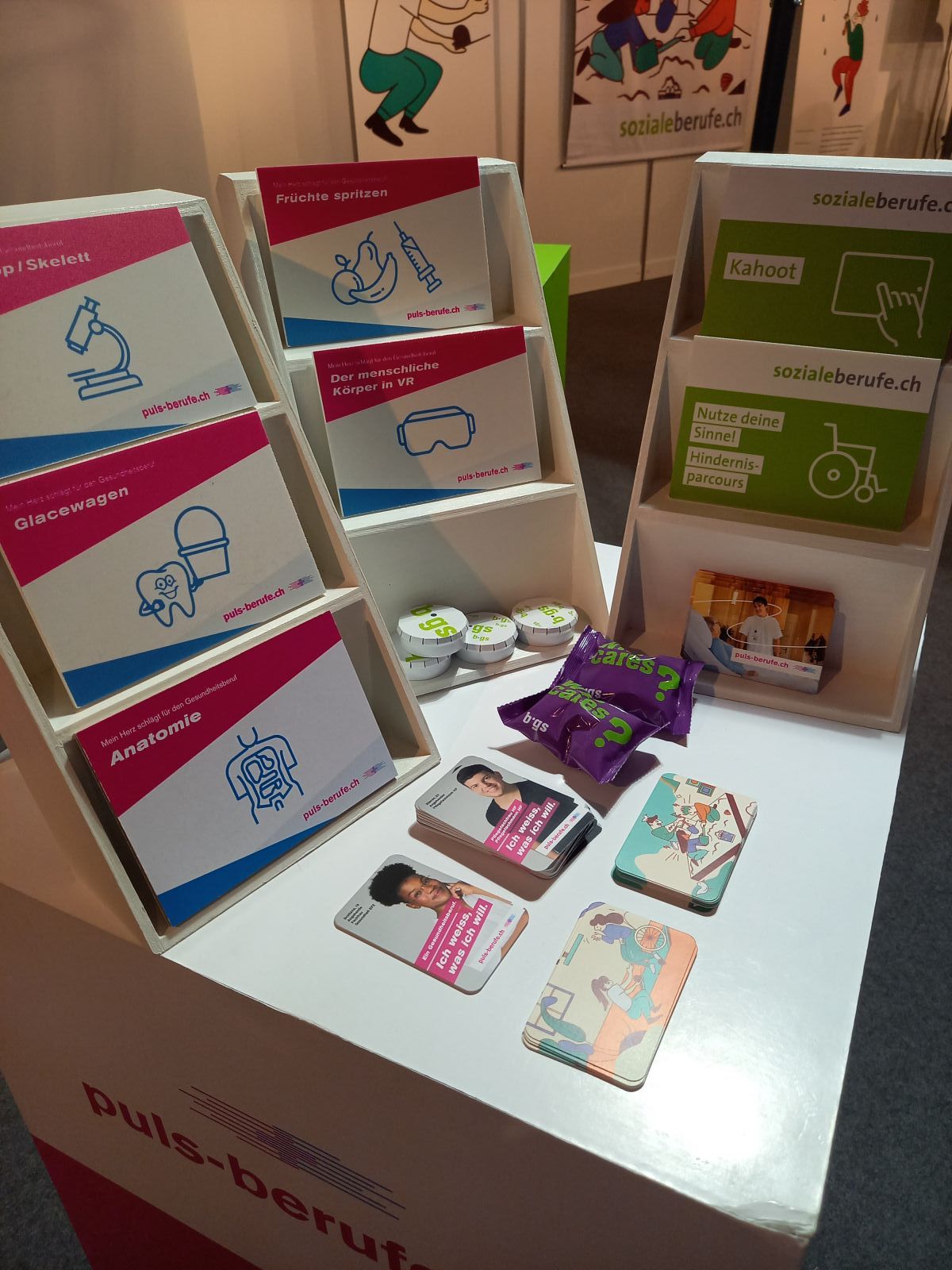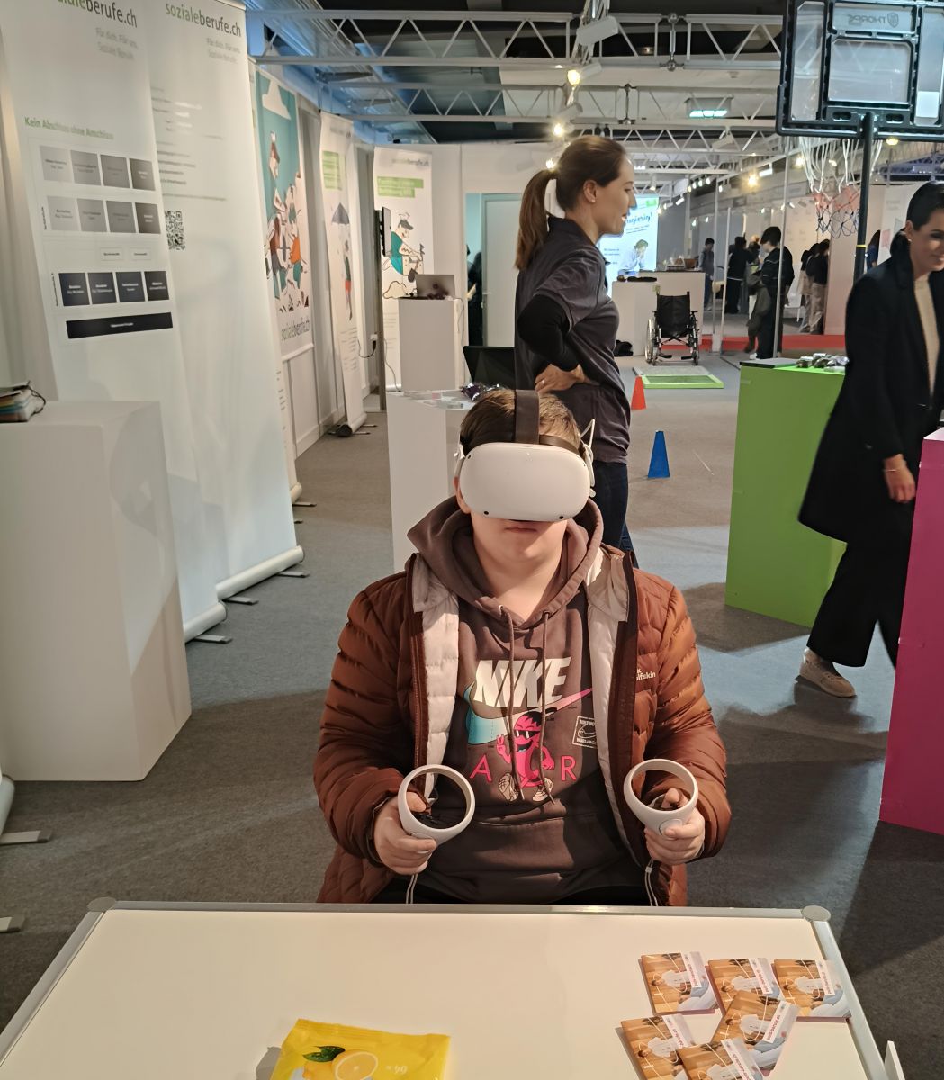 An unserem Stand konnten die Besucherinnen und Besucher praxisnah und interaktiv in die Berufswelt eintauchen. Ein besonderes Highlight war der gut besuchte Hindernisparcours ("Nutze deine Sinne"), der ihnen die Möglichkeit gab, Beeinträchtigungen hautnah zu erleben und sich so in die Situation von Menschen hineinzuversetzen, die auf Hilfe angewiesen sind. Grosse Begeisterung weckte auch die Anatomie-Ecke, in der man mittels VR-Brillen das Herz anschauen und den menschlichen Körper virtuell erkunden konnte. Engagierte Fachpersonen unterstützten die Jugendlichen zudem beim Kennenlernen der Organe am Torso.